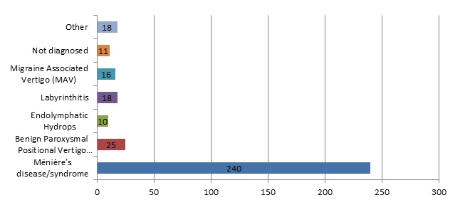 Not surprisingly as we are the Ménière’s Society, almost all (85%) of respondents have been diagnosed with Ménière’s. Some respondents had also been diagnosed with other conditions but this was by no means universal. However, as we also endeavour to provide information and support to people with other vestibular conditions, we are looking at further ways of widening our membership.