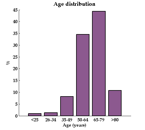 A considerable majority (77%) of respondents were age 50 or older, with 43% being between 65 and 79. This is in line with the average age of 59.4 found for Meniere's subjects included in the Biobank study [1].