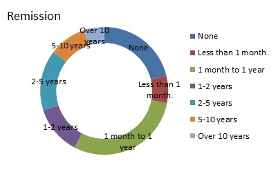 Survey respondents told us that they had been ‘putting up’ with their condition for a long time; almost nine in 10 have had the condition for over five years and for over two thirds it’s been 10 years or more. Almost half of respondents (44%) were referred to a specialist within three months of presenting to their GP with the symptoms, but sadly almost a third (36%) had to wait over six months and one in ten (11%) were waiting over two years for this to happen. We didn’t question whether this was because the GP tried various remedies or was due to waiting time to see specialists. But it would be good to be referred quickly when presenting with Ménière’s-type symptoms. Two in five respondents have had remission of the symptoms for over a year with one in seven being in remission for over five years, but an unfortunate quarter (28%) have had little or no respite.