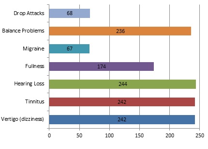 It is probably not surprising that almost all our respondents reported ‘vertigo’, ‘tinnitus’, ‘hearing loss’, and ‘balance problems’. More than half reported ‘aural fullness’, but about a quarter had migraine, and a similar number reported ‘drop attacks’. The Society thus is fulfilling its objectives to support and assist sufferers from these conditions, and we appear successful in this so please ‘spread the word’.