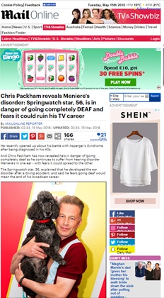 The article in the Mail Online on 15 May 2018, says the Springwatch star, 56, is in danger of going completely DEAF and fears it could ruin his TV career.