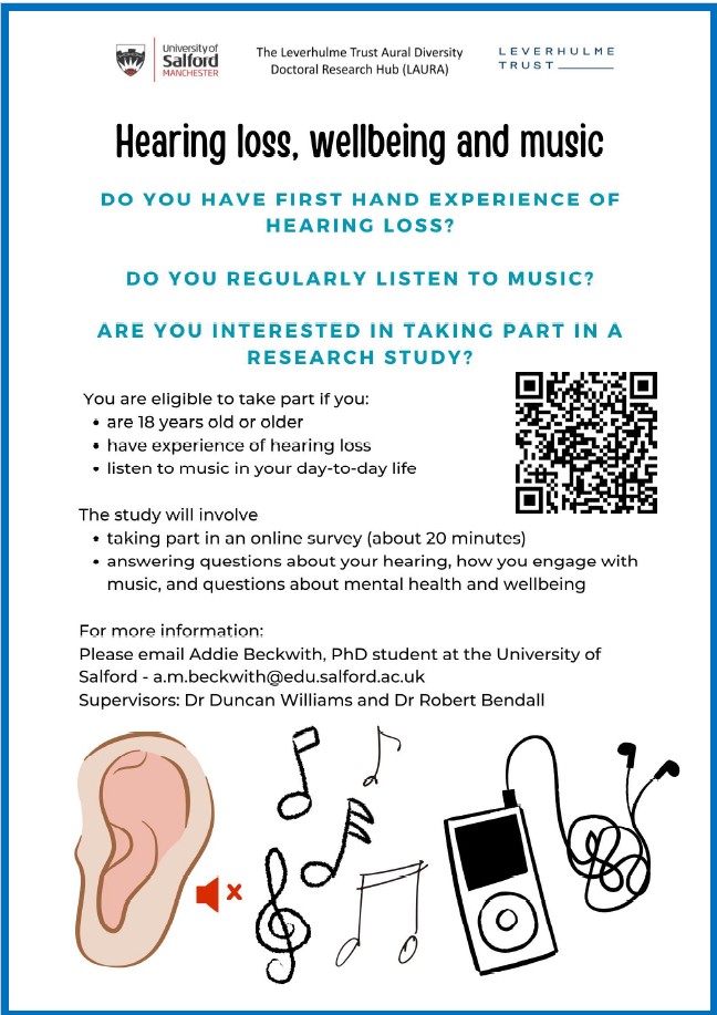 To take part, visit: https://app.onlinesurveys.jisc.ac.uk/s/salford/hearing-loss-wellbeing-and-music or use the QR code on the attached flyer.